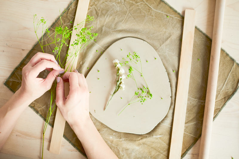 Avec la technique d’estampage, vous personnaliserez très facilement (impression de feuilles…) vos créations.