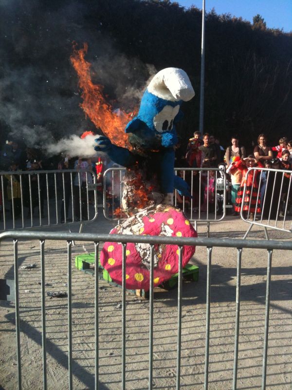 Le tour se termine au champ de foire, où le bonhomme Carnaval est prêt à être brûlé, oui tel est son sort… C’est la tradition du Caramentran, toutes nos erreurs et bêtises de l’année doivent disparaître dans ce grand feu de joie. Les festivités se poursuivent dans la salle polyvalente avec des crêpes et un spectacle de magie qui a été apprécié mais aurait mérité d’être sonorisé.
