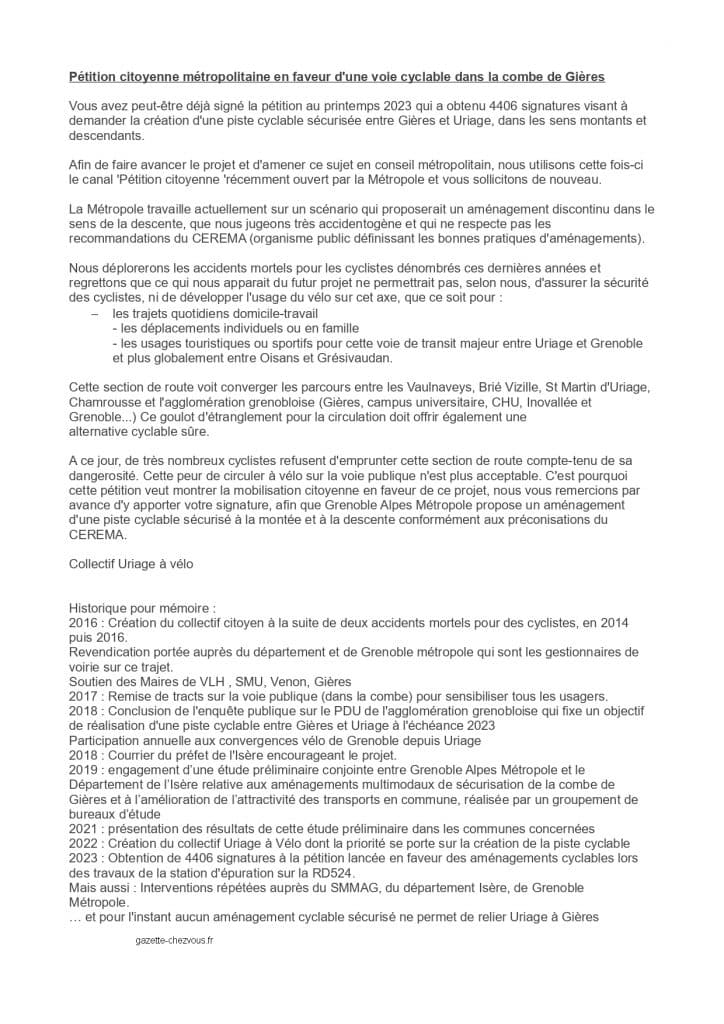 Elle est disponible en ligne à : Pétition citoyenne – Pour une voie cyclable dans la combe de Gières – Plateforme Métropole Participative (metropoleparticipative.fr)