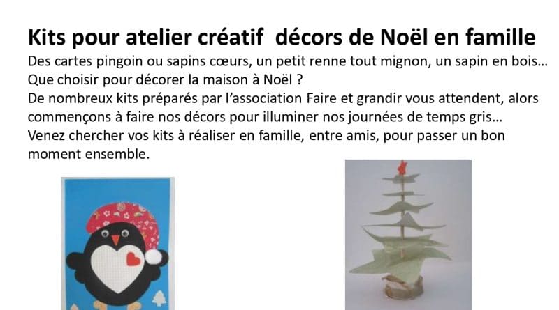 Samedi 27 novembre, l’association Faire et grandir vous propose de venir chercher vos kits créatifs de Noël.