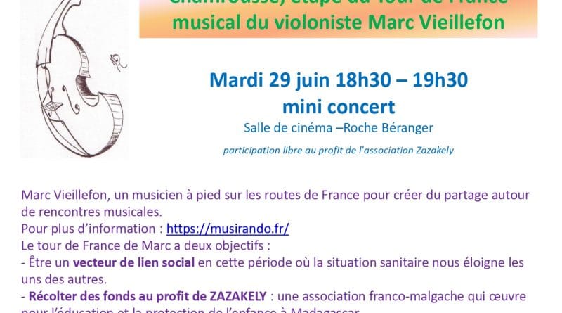 Dans le cadre du tour de France musical du violoniste Marc Vieillefon, un mini concert sera donné à Chamrousse le mardi 29 juin de 18h30 à 19h30